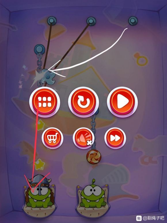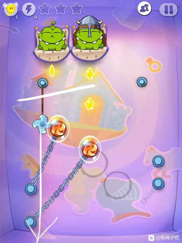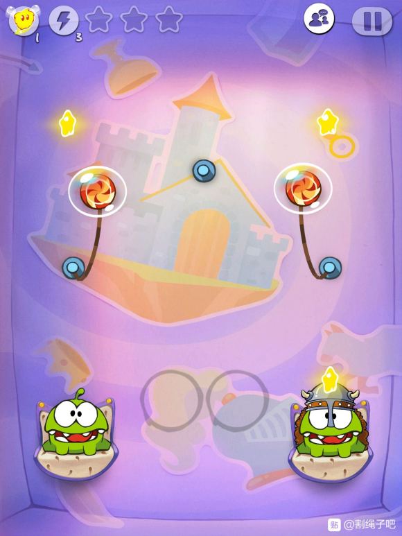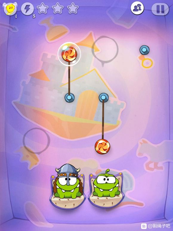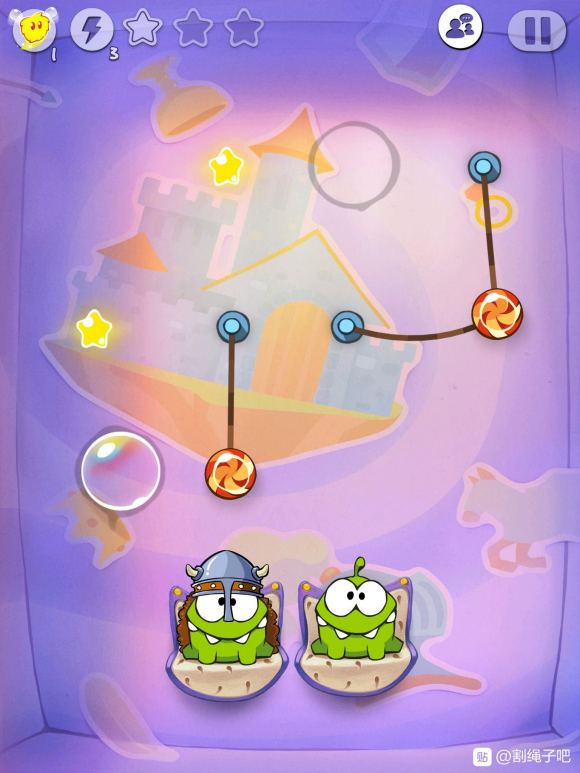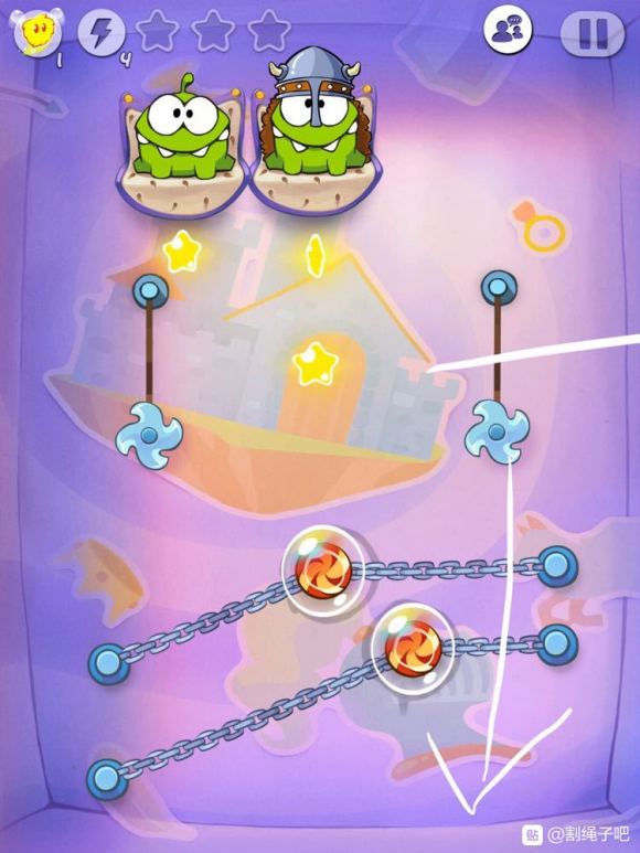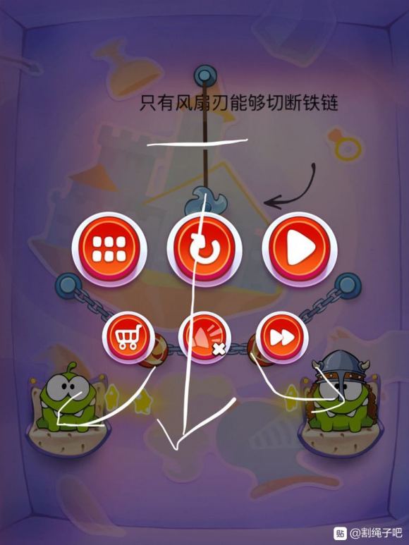 先切断右边风扇刃的线,等泡泡飘到马上要被左边风扇刃切碎的时候,切断左边风扇刃的线即可。