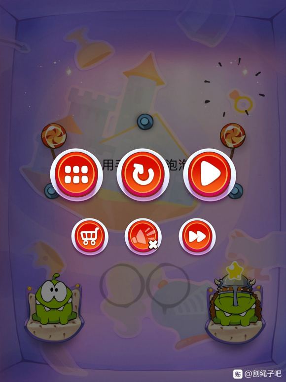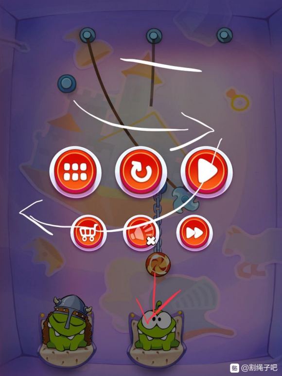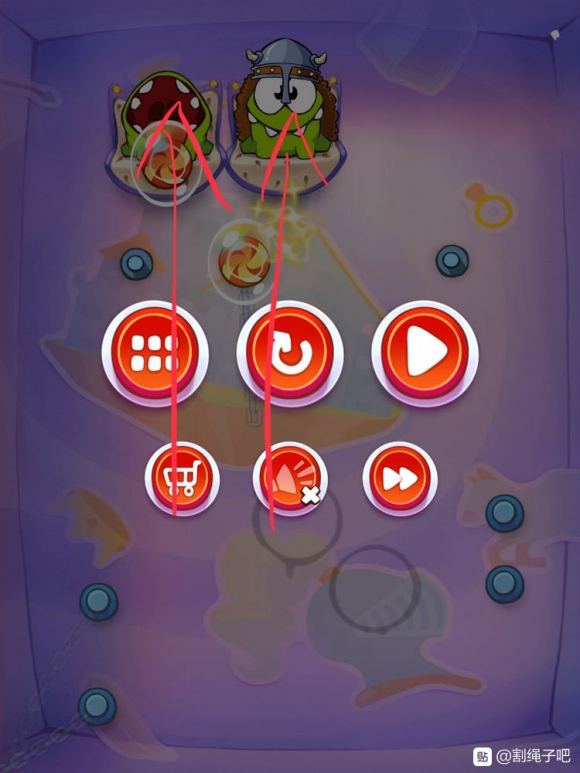 先点破右上角糖果的泡泡,切断右上角的线,在点破泡泡,划断剩下的线即可。