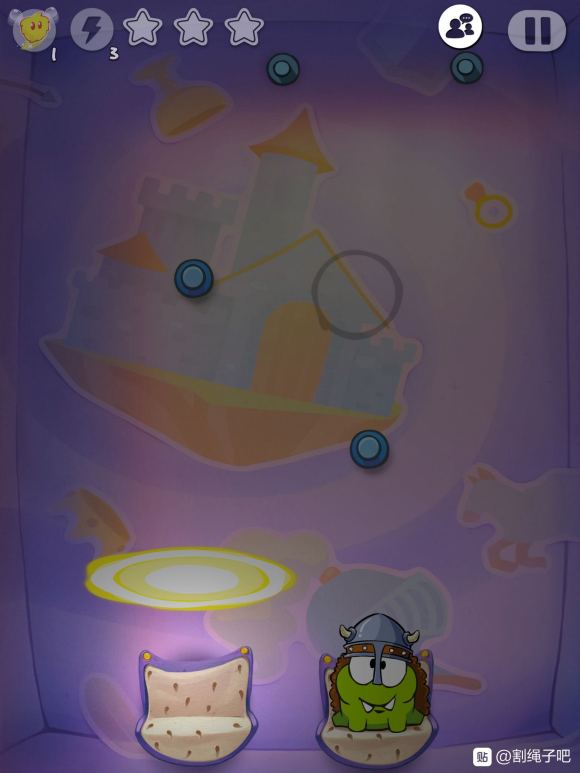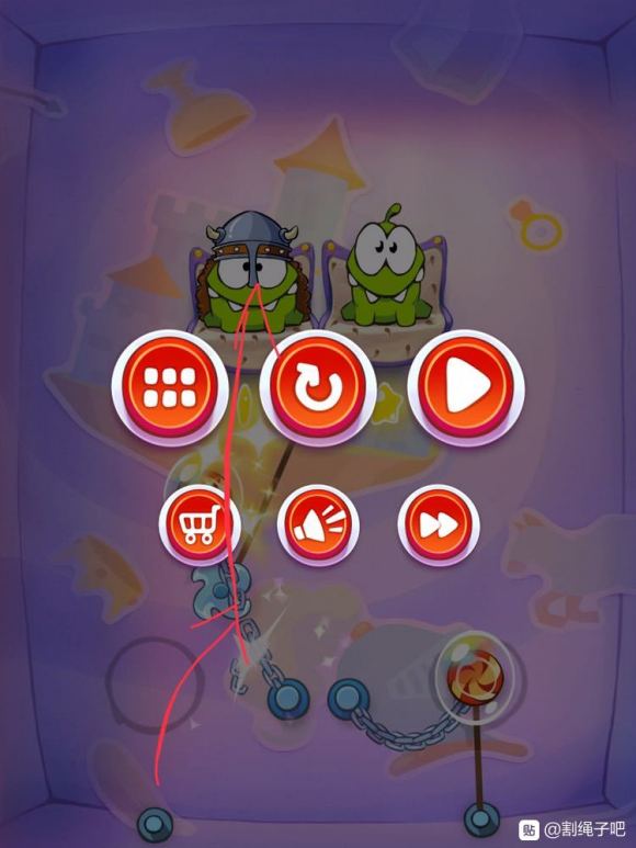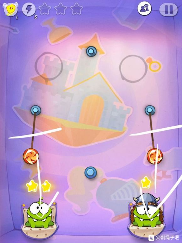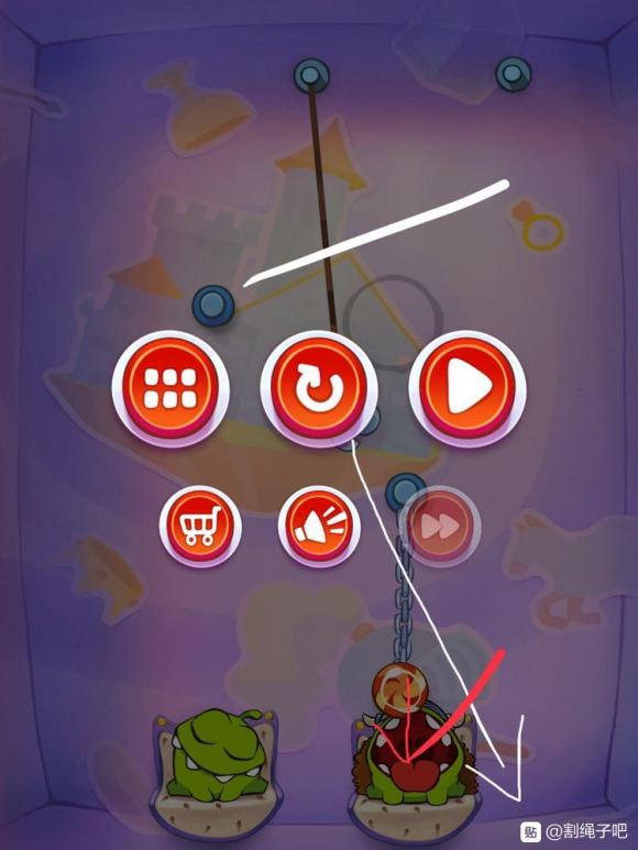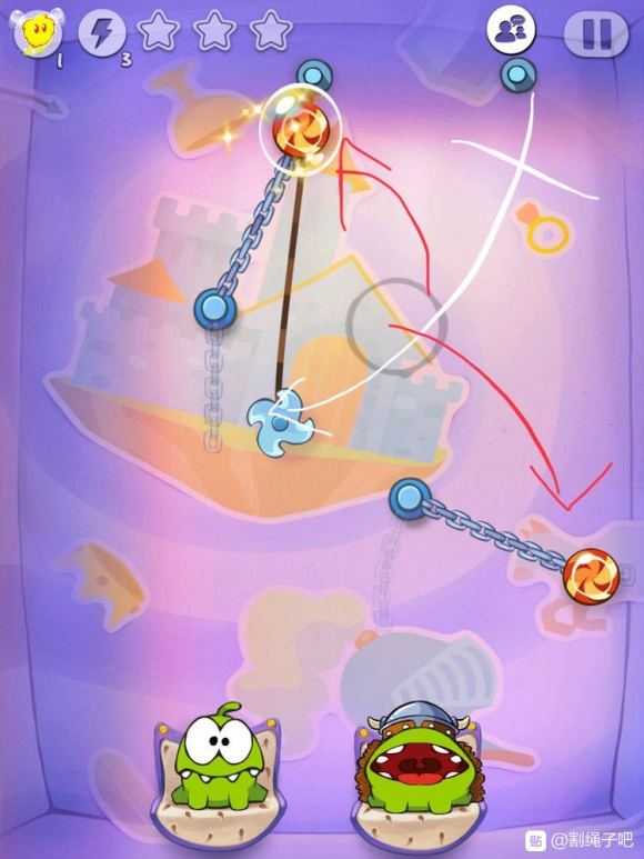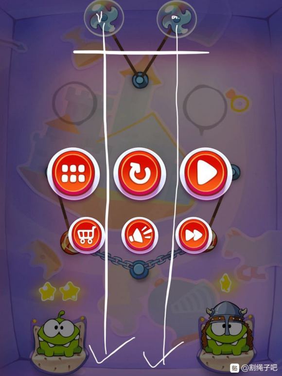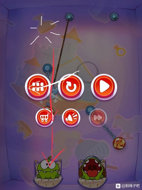 先切断风扇刃的短绳,等风扇刃掠过后点破泡泡,然后找准时机切断长绳,即可过关。