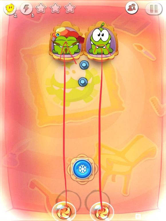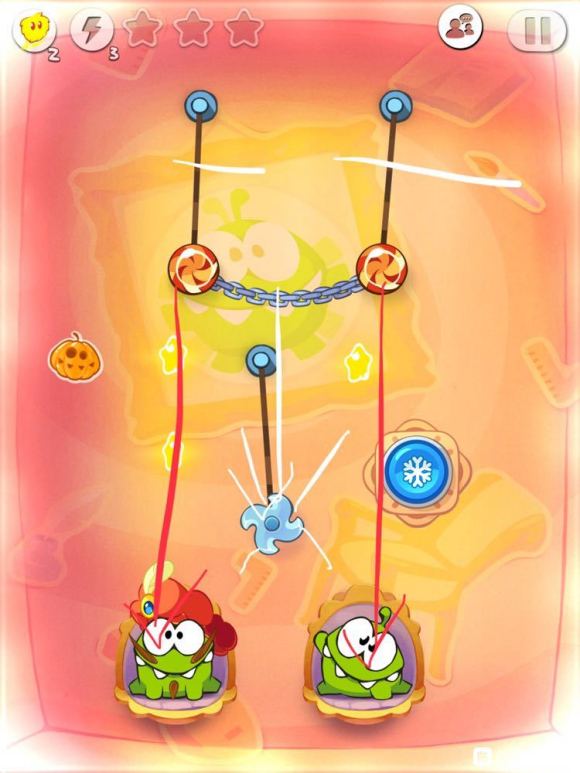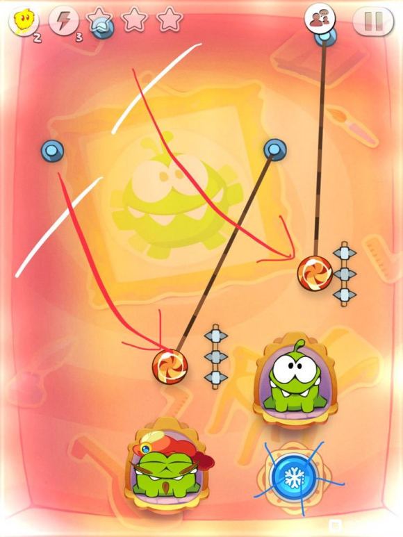 当两糖果和风扇刃到如图局势时暂停时间,切断两糖果的两绳,开始时间,中间的铁链会被风扇刃切断,最后到达两个小吃货。