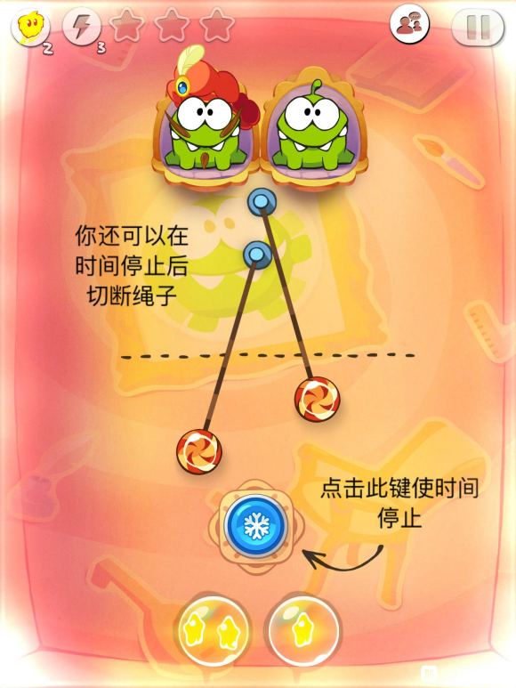 趁着两糖果掠过泡泡时暂停时间,划断绳子,然后再开始时间即可。