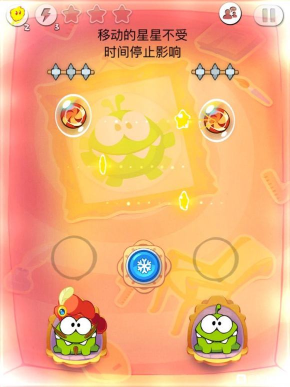 再两糖果到达第三星星路径时暂停时间,等星星收获以后点破泡泡,再待第一星星和第二星星到达两糖果正下面后开始时间即可。