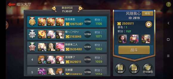 二:右边的组队竞技,当队长一定要礼拜4卡凌晨 冲一波,就算你不冲也会被人挤下来。 时间节点很重要,反正我只要卡凌晨了小V也能前50 ,大v 就能创造更好收益。从图片就可以看出最后的激烈了吧!!哎,直接把我从100多推到前50 ,哎,真不容易。我们公会最强组合余生队。这是刚刷新的时候,蹭一波第一。哈哈。