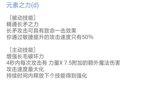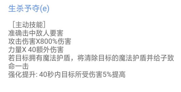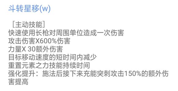 增益性技能,加强个别技能。具体加强大致三类。1.DQ连招,在0.50版本更新中可以使被DQ过得敌方单位变色。变色的敌方单位你个人对其单位的致命一击概率提升50%。2.DE给单个目标添加一个5%的增伤(所受伤害提高5%)【强调:所有的伤害,不单单是个人!!!】3.DWQ使得最后的Q伤害强化。是魔枪除了T和F之外最为强势的输出来源。