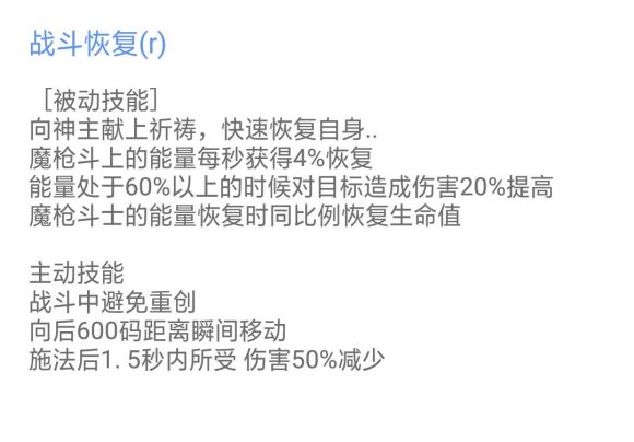 R是魔枪唯一回血技能,与能量条同比例回复自身生命。也就是说在能量条不满的情况下每秒会获得4%的生命恢复。同时也是个极为强大的增益。60%能量以上20%的伤害提升。位移效果:向后倒退600码,和Q的距离相同。也可用于穿线和位移。并且使用R后的1.5s内会有50%的减伤,合理利用可以大大提高魔枪的生存能力。