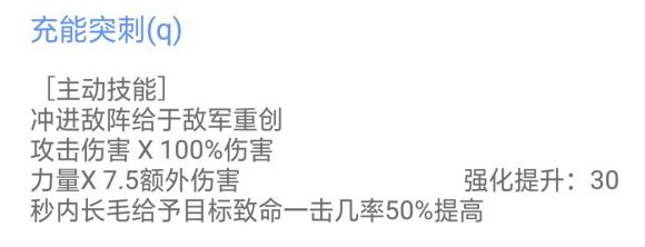 Q向指定位置突进(大概是700码,不可自主控制距离,强制600码左右。哪怕你选定1码的距离释放,也会冲到600码外),可穿线(白牛和火灵的线都可以),配合DQ和DWQ可以合理打出伤害。单单使用Q的伤害并不高,没有D和W的情况下只能打出微弱伤害和用于位移。