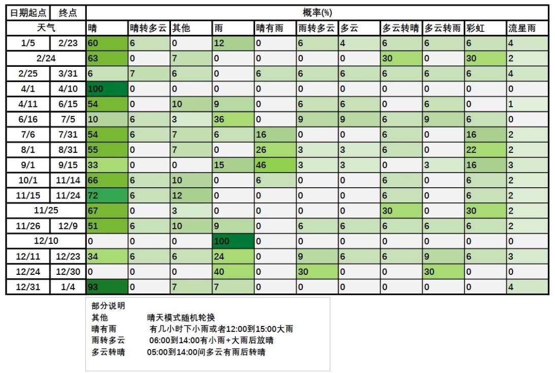 动物森友会《AnimalCrossing》天气模式出现时间与概率