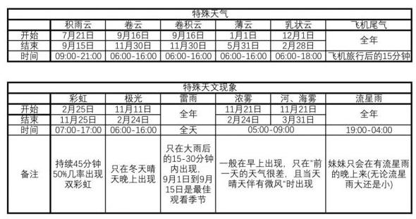 彩虹、极光、雷雨、雾、流星雨。妹妹只会在有流星雨的晚上来(无论流星雨大还是小)。这些现象的描述和具体时间见下图: