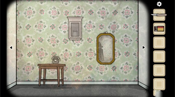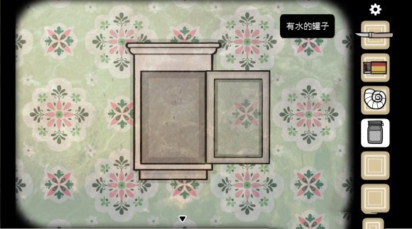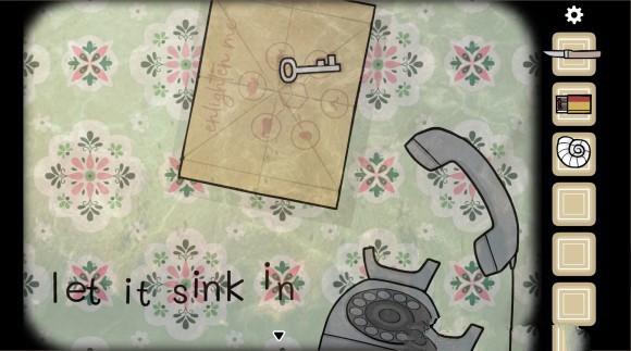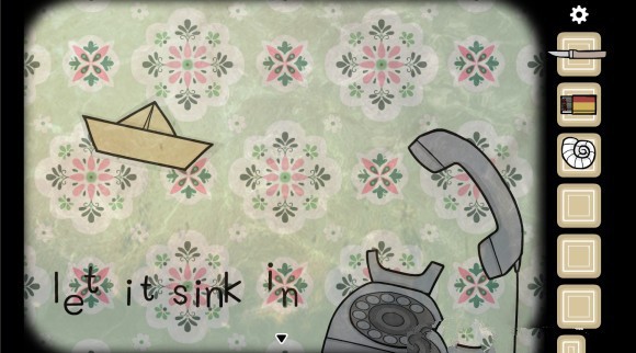 上面这张图中英文是“let it sink in”,让它沉到这里来吧,接着一只纸船就沉了下来,点击纸船,纸船会经过一系列的旋转跳跃,恒等变换,最后展开成一张纸,这张纸正是我们在“大黑”房间里面看到的那张,同时还有一把钥匙,有经验的玩家都清楚,这很显然是打开玻璃柜子的。然后,在打开玻璃柜子之后,我们得到了玻璃瓶。
