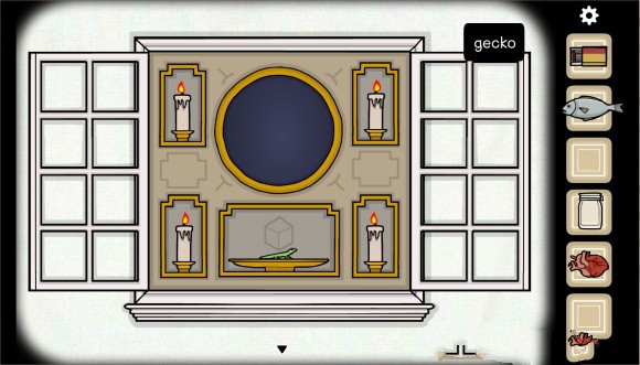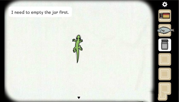 之后我们要做的就是抓住那只可爱的小壁虎,过程很简单,就是把罐子放到壁虎后面,轻轻一抓~壁虎就进去了,值得注意的是,此时如果罐子里面有水,主角就会说他需要空罐子,这时我们需要把水放进玻璃柜子上面的花盆里,来把壁虎捉住,然后我们就可以用壁虎当祭品,进入“壁虎”房间。