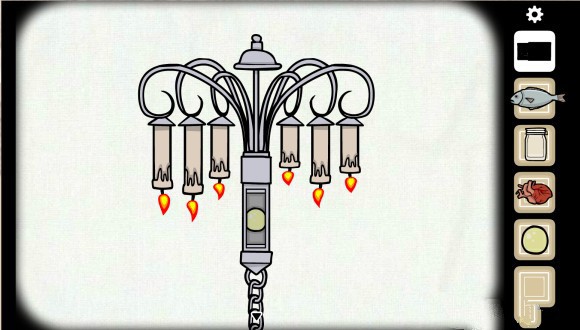 取出花盆里面的的弹珠(英文marble,有大理石的意思),然后右转点进吊灯(自磨坊以后难得的天花板场景),这里需要按照蜡烛从低到高的顺序点燃,就会得到第二个弹珠,因为这种迷题已经出现过一次了,并且比之前的一次还要简单不少所以没有什么难度。