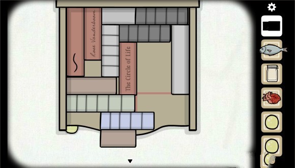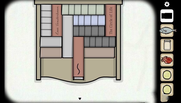 在轻轻松松的拿到第三个弹珠之后,我们进入了本游戏的第二个小难点,摆书,这里可以看到书柜上面有着一段红色的折线,很显然只有在这条线上面才能有书,而那本有符号的书要在中间。