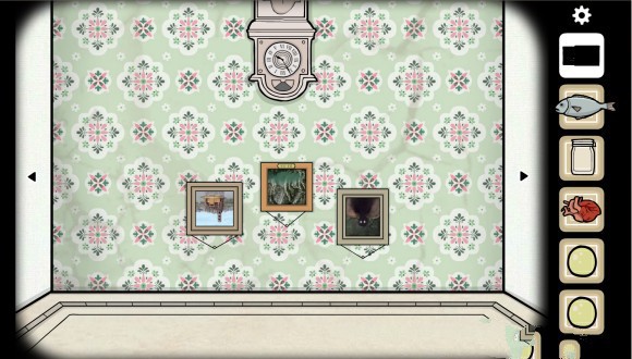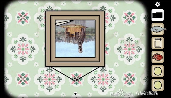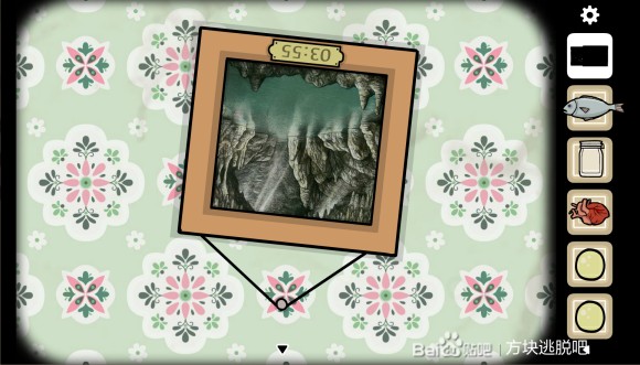 如果眼尖的话,我们就能够立刻点进中间那一个画框,然后直接到壁钟那里面输入03:55,获得三角钥匙。