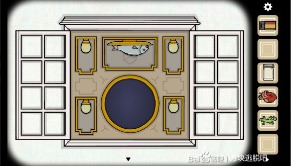 然后我们就理所应当的想要去找其他两个房间里面的壁钟来获得另外两块三角钥匙,首先摆上鱼到鱼房间