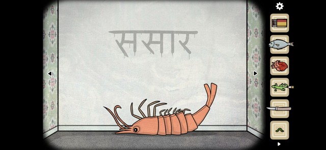 画着神秘符号的墙下有一只巨大的虾。