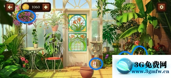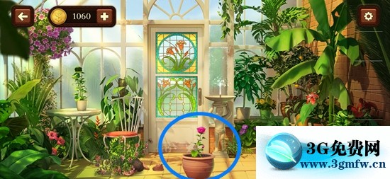 使用剪刀,将吊在天花板的盆栽剪断,掉落在地上。然后使用铲子铲一些土,放到中间的空盆中。将得到的花的种子倒入,再给他浇一些水,开花之后,钥匙就出来了。