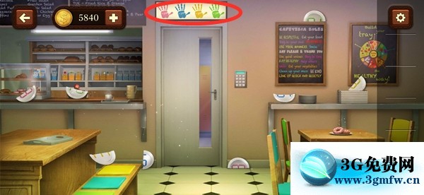 根据门上方手印的顺序,排序不同颜色盘子上的数字(粉色、蓝色、黄色、绿色)。