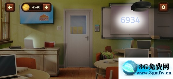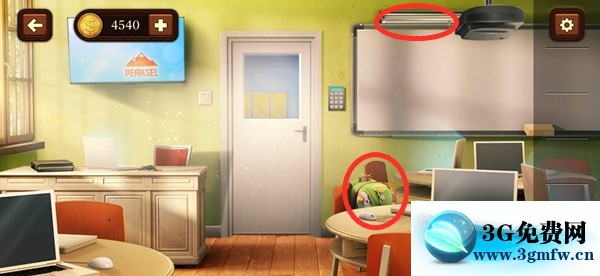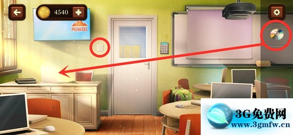 首先在场景中,点击获得绿色书包里的CD。将黑板上面的投影幕放下来。