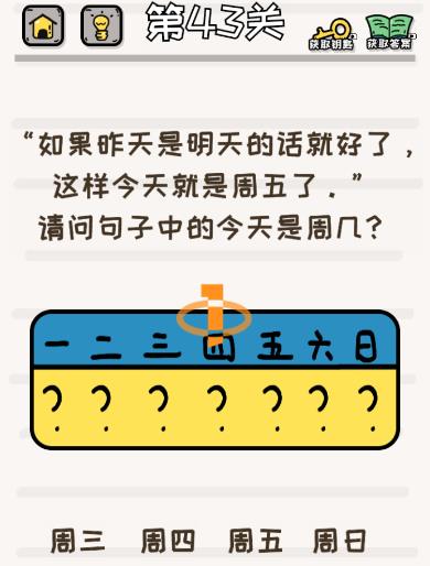 如果昨天是明天的话就好了,这样今天就是周五了。”请问句子中的今天是周几是《挑战小学生》第43关的问题,很多网友不知道答案是什么,下面小编给大家带来挑战小学生第43关攻略。