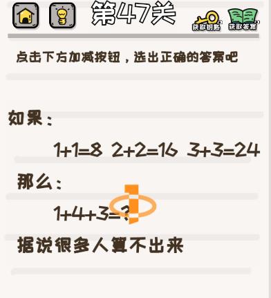 如果1+1+8、2+2=16、3+3=24,那么1+4+3=是《挑战小学生》第47关的问题,很多网友不知道答案是什么,下面小编给大家带来挑战小学生第47关攻略。