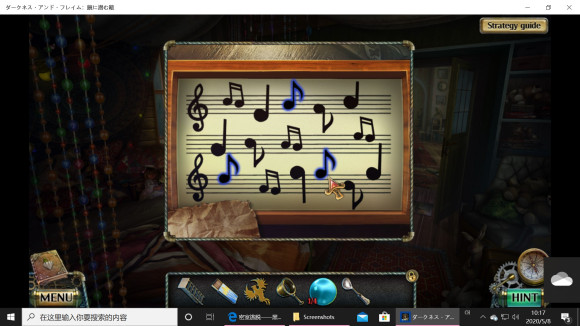 16、抽屉中的木盒上按提示按下相同的音符,得到提示纸、拼图1。