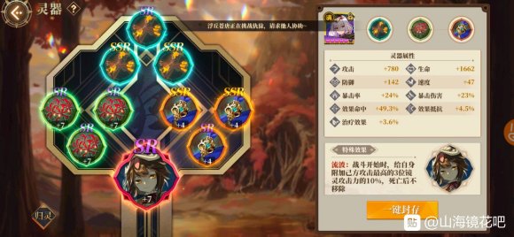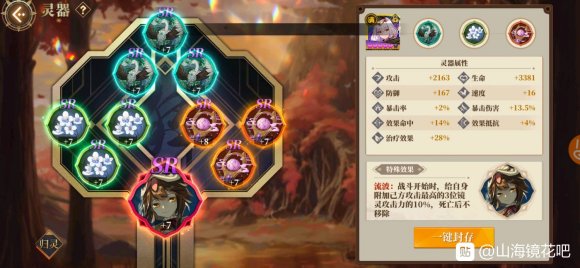 第二种玩法,主堆速度,效果命中和暴击,适合短时间作战的副本,以及PVP,通过高速度先手沉默对面主C位,让对面放不出技能,暴击率保证3技能的伤害,给共工攒更多的球,配合天狗共工一套秒杀对面,共工技能没满当我没说,下面是灵器搭配。
