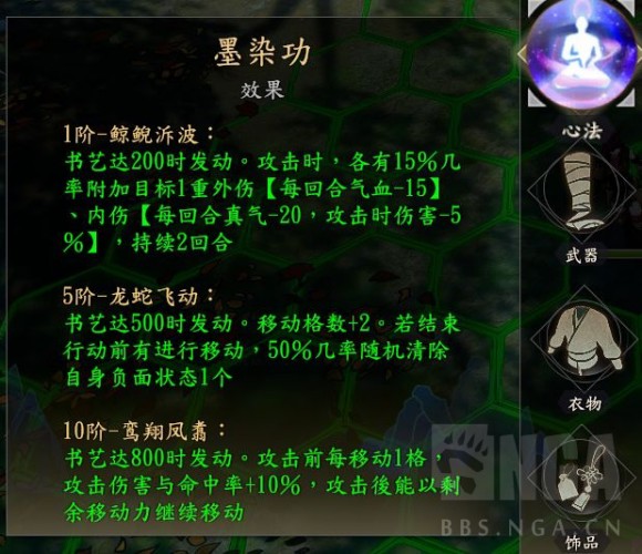 墨染功目前是全方位无死角。要输出有输出,要灵活有灵活,要战略有战略(攻后再动,如果不动还可以直接待机回复额外一次内力)可能会被nerf。毕竟我想不到后期有啥内功需要比这个更强了