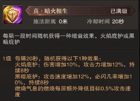 暗火相生,战斗开始,给你一个BUFF,火焰庇护或者黑暗庇护,火焰庇护加攻击和伤害,黑暗庇护加攻击速度和必闪,记住这两个守护,这是圣导师职业体系的核心,后面很多技能和天赋在庇护状态不用的情况下效果都有很大的区别。