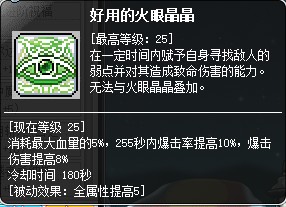 理由很简单,火眼能提高暴击率和暴击伤害,而暴击伤害天生自带就有20-50%(不显示在面板上),平均下来就是35%,也就是说,不暴击的伤害是100,暴击的伤害就是135%(这只是天然暴击伤害),所以满暴击率的重要性想必大家都知道了,更何况还有爆伤加成,所以是首选。