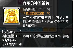 俗称假花,加经验和掉落率的buff,原本是主教职业特有的增益类技能,五转后贡献到全职业都能戴,效果弱化因而称之为假花。只要你没有满级,刷图的时候都需要带,槽位充裕的情况下打BOSS你也可以带上提高获得战利品的爆率(万一出货了呢),而且假花的持续时间以及效果是随着等级增长而增长的,满级就是图中的效果。