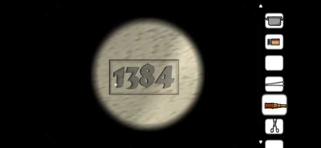 用望远镜观察一下之前看到的教堂,视角拉近后,在教堂的墙壁上得到数字“1384”。这应该就是密码门的密码了!