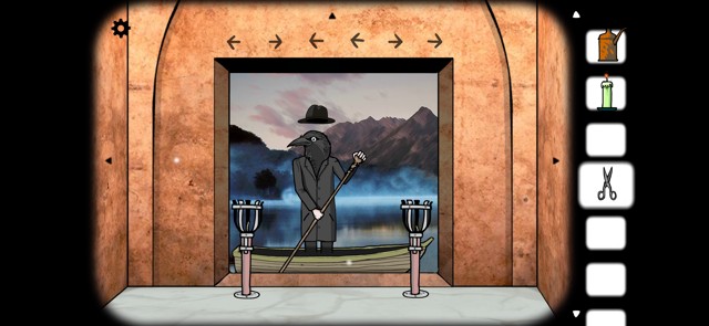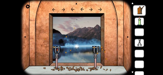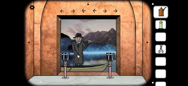 用蜡烛点燃两侧的火把。并按照石门上方的提示“左右左左右右”,以这个顺序往两侧火把里添油。远处的小船好像看到了我们发出的信号,并做出了回应。点击小船,船夫就会驾驶者小船向我们驶来。