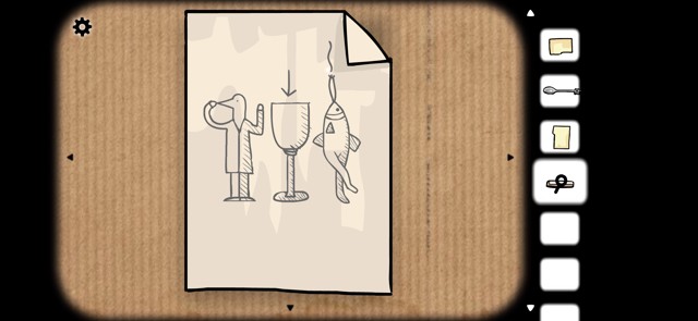 开局的场景里,有一颗鸟蛋、一个杯子、一只汤匙、以及一条咸鱼。调查后可以将汤匙以及酒杯后的小纸条带走。