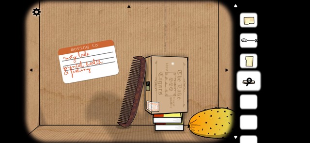 下一面场景,箱子上贴的标签上写道“将箱子寄到锈湖精神健康与钓鱼中心”。同时场景里的道具有梳子、上锁的盒子、两个火柴盒、一个不知道名字的水果。