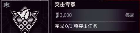 突击专家:完成1项突击任务。难度简单。萌新完成“内战”才有突击任务。突击任务看上去等级高,但已然成为这游戏每日任务一般的存在,即使某一天的突击任务有间谍/刺杀不好做,七天总会有一天任务不存在间谍/刺杀,最顺手的任务。