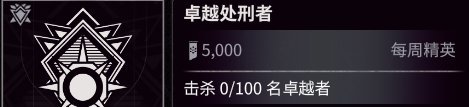 卓越歼灭者:击杀30名卓越者。难度简单。日常刷任务就可完成,圣殿、无尽类任务(生存、防御、挖掘)高波会出现较多卓越者,水经验刷专精挖核桃刷材料的时候顺手完成即可。养肝者也可等突击任务的卓越者大本营以快速完成该任务。