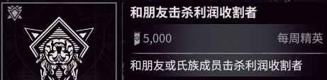 刺客:完成3项刺杀任务。难度简单,基础任务。最早的刺杀在地球,但地球BOSS不好打,建议萌新打火卫一的BOSS;大佬可以一边做每日突击一边完成,若周日时仍未完成再去刷火卫一中士。