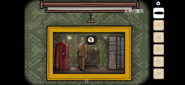 在画上找到小黑的位置,用燃着的雪茄去点小黑的脑袋处。漏出隐藏在画后面的钥匙。