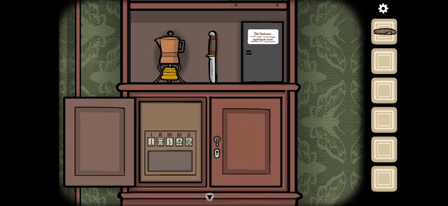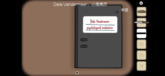 用钥匙打开一号柜子上的百叶帘,在下面的架子上得到刀,除此之外还放着咖啡机以及Dale的心理病例。