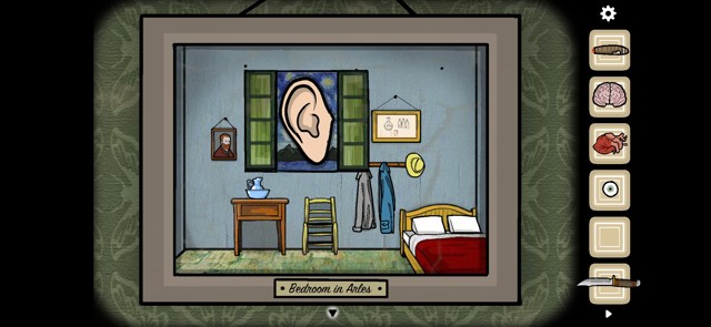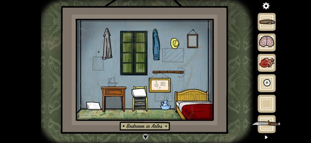 来到“阿尔勒”这幅画处,讲之前病历中得到的标签贴上去。之后画上的物品会发生错位,根据物品轮廓将其复原。