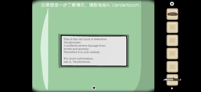 之前瓶子上的模糊标签上会清晰显现出字,上面写着(这是侦探Davandermeer的大脑,因为焦虑以及压力,这个大脑早到了严重的破坏,现在这个大脑没用了。想要了解更多信息请打给vanderboom先生)