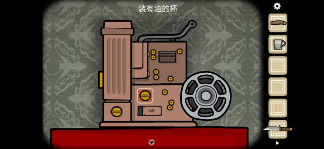 用空杯子到放映机这里,用杯子接住往外冒的机油。