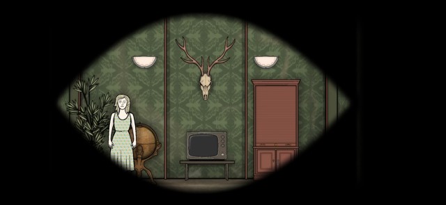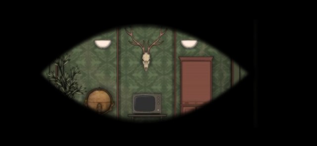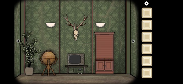 主角醒来发现自己身处一个未知的房间里,老规矩先对四个场景进行一番扫描式的探索。①号场景。粗略观察,首先映入眼帘的是墙上的鹿头,是绣湖系列的常客了。桌子上一台电视机,不过连接线断掉了。一盆绿植,叶子很像锈湖旅馆里的迷迭香。除此之外立柜三个空间均被锁上了,一个需要密码,两个需要钥匙?。地球仪也暂时无法打开。(这里可以先把地上那个好的插头插到插座里)