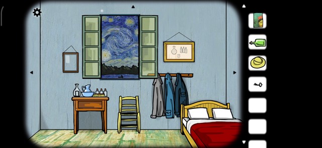 来到这边,捡起掉落的钥匙。打开窗户可以发现外面的景色是梵高的画作。