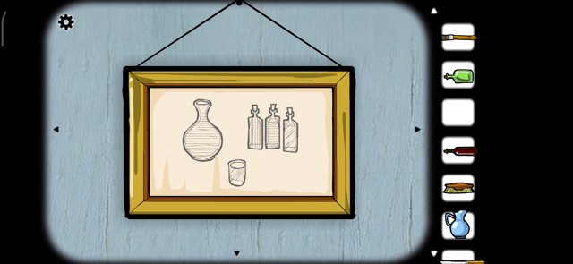 调查右上角的画,发现内容和桌子上的瓶子布局一模一样。结合之前看到的画,得到“竖线对应水,斜线对应苦艾酒,横线对应最后一种饮品”的结论。
