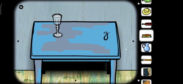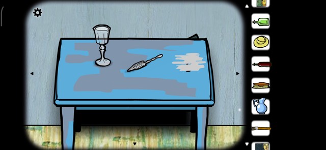 在桌子上得到滤勺和一块碎片。用刷子可以刷掉污渍,发现对应蓝色的符号。