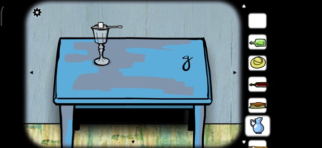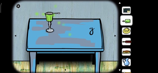 来到桌子上,将滤勺方糖和杯子组合,用苦艾酒多次冲刷方糖,可以得到最后一块碎片。