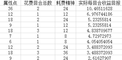 这篇攻略里一共练四艺15回合,刚好收获精神250点(10次15+5次10)。也就是说,假设第一年始终要取得这250点精神,并用15回合。那么在第一年里每点精神 需要花费 15 ÷ 250 = 0.06 回合
