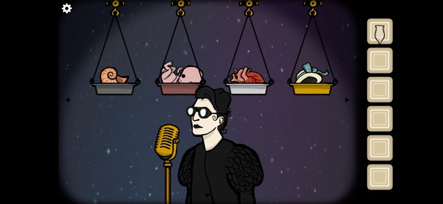从天上降下四个天平,但是加上本来就存在的帽子,我们只有两件物品可以放上去。
