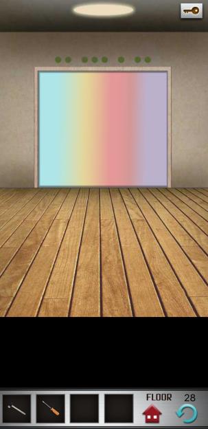 电梯门上什么都没有,点击它会变亮,但瞬间就恢复原样。看到门的上方有排列不整齐的灯,2-3-1-2,只要按照这个数字依次点击门,就可以打开了。 点击绿色箭头进入下一层。